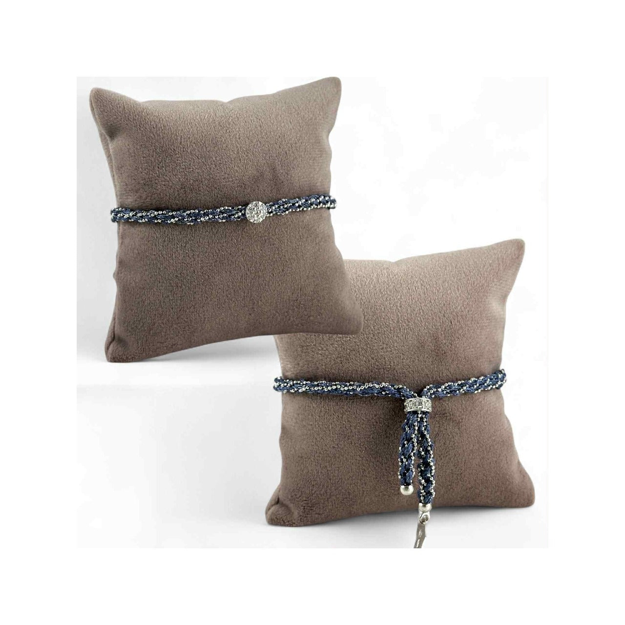Bracciale realizzato in argento e seta celeste intrecciati entrambi con elementi in zirconi tra cui una rondella per regolare la lunghezza e un elemento tondo. Made in Italy di Patrizia Farinola.