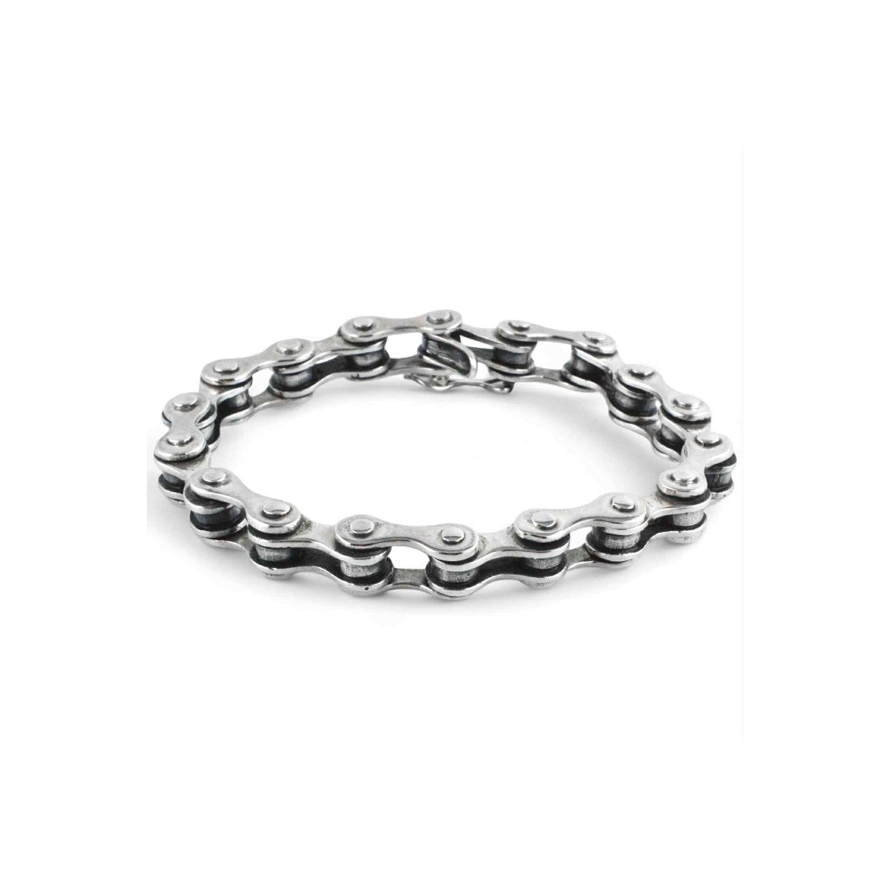 Bracciale uomo in argento a forma di catena di bicicletta. Tutte le maglie sono incernierate tra di loro con chiusura a scomparsa per una lunghezza totale di 20 cm. Made in Italy.